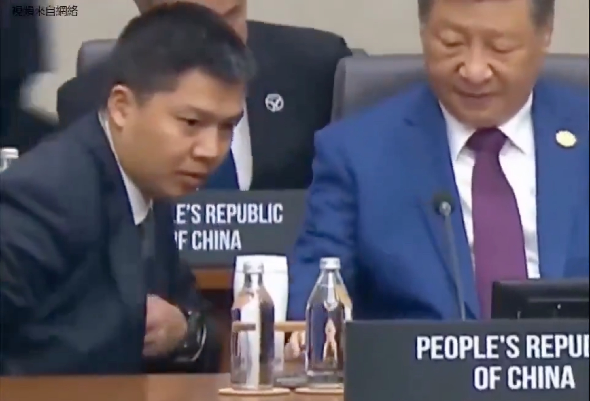 Khi tham dự Hội nghị APEC tại Gyeongju (Hàn Quốc), ngay sau khi vừa ngồi xuống ghế, một vệ sĩ đi theo sát Tập Cận Bình lập tức bước lên, ngồi xổm bên cạnh ông, nhanh chóng lấy từ túi trong áo ra ba món đồ rồi lặng lẽ đặt lên bàn trước mặt Tập. (Ảnh chụp màn hình video trên X)