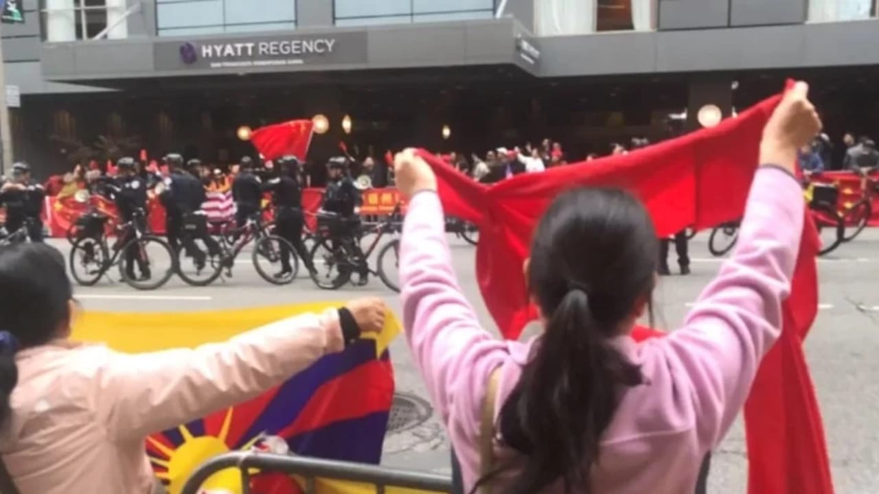 Những người biểu tình giận dữ xé lá cờ máu năm sao và vẫy về phía những người thân Cộng ở đối diện. (Ảnh: Leng Tao / Vision Times)