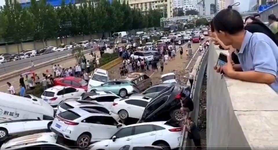 Đường hầm ở Trịnh Châu bị nước lũ tràn vào nhấn chìm rất nhiều xe đang lưu thông. (Ảnh cắt từ video).