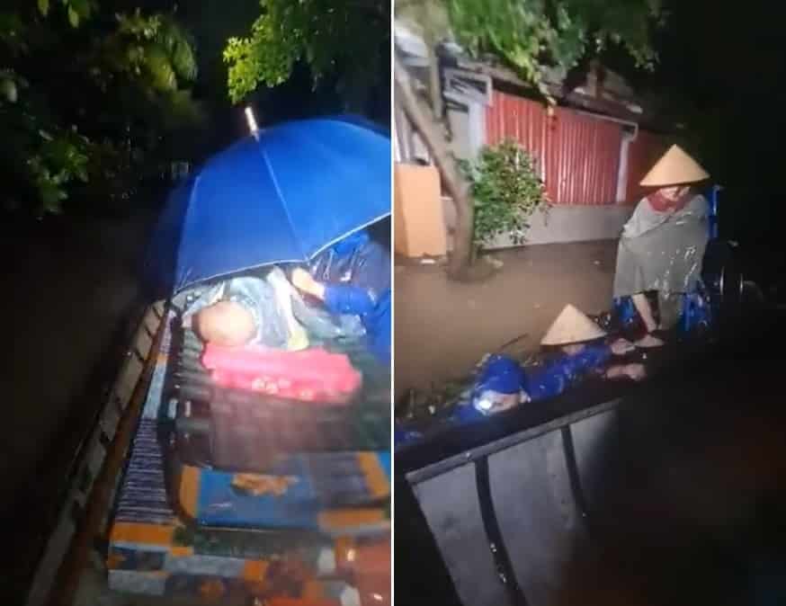 Một cụ ông bị liệt được lực lượng cứu hộ xã Xuân Ninh (huyện Quảng Ninh, tỉnh Quảng Bình) di tản trong đêm khi lũ vây, 19/10. (Nguồn: dẫn qua FB Dương Phong)