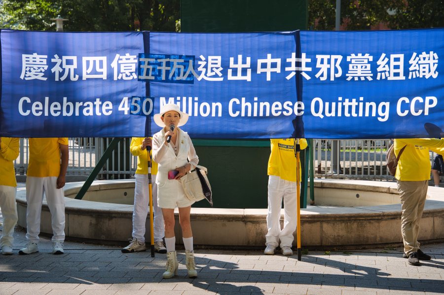 Ngày 16/8/2025, nhà lãnh đạo phong trào dân chủ, bà Thịnh Tuyết (Sheng Xue) đã phát biểu tại buổi mít-tinh kỷ niệm 450 triệu người thoái xuất khỏi Đảng Cộng sản Trung Quốc, tại Toronto, Canada.