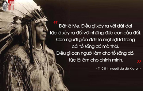 “Đất là Mẹ. Điều gì xảy ra với đất đai tức là xảy ra đối với những đứa con của đất. Con người chưa biết làm tổ để sống, con người giản đơn là một sơi tơ trong cái tổ sống đó mà thôi. Điều gì con người làm cho tổ sống đó, tức là làm cho chính mình.”