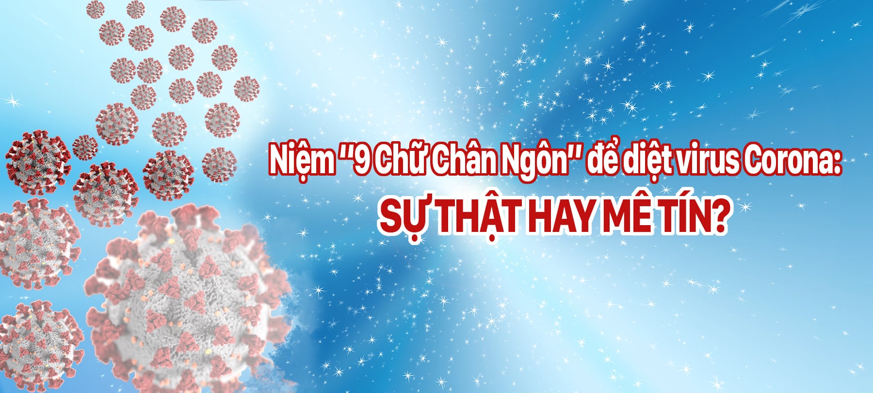 Ngày 2/2/2021, trang mạng Chánh Kiến có đăng bài viết với tựa đề “Hiệu quả niệm 9 Chữ Chân Ngôn chống lại COVID-19” trong đó có một video cho biết một số người bị nhiễm virus viêm phổi Vũ Hán kể lại rằng việc niệm 9 chữ “Pháp Luân Đại Pháp hảo, Chân Thiện Nhẫn hảo” đã giúp họ thoát khỏi căn bệnh chết người này. Trong khi virus Corona đang lây lan với tốc độ chóng mặt trên thế giới, khiến hơn 124 triệu người nhiễm bệnh và 2,7 triệu người chết sau 1 năm thì việc đọc 9 chữ đơn giản có thể giúp người ta thoát khỏi căn bệnh này quả thật là khó tin. Đây là sự thật hay chỉ là mê tín? Chúng ta cùng tìm hiểu thực hư việc này như thế nào.