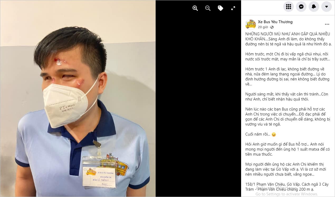 Trên hình đăng kèm bài viết, một anh thanh niên khiếm thị bị trầy xước khắp mặt sau khi vấp ngã. Bài đăng trên nhận được sự chia sẻ, đồng cảm của nhiều người dùng mạng. Một người dùng mạng cho hay hôm trước vừa được anh thanh niên trên massage, khen rằng anh “dễ thương và tận tình lắm”, hẹn qua Tết sẽ trở lại ủng hộ mọi người tiếp.
