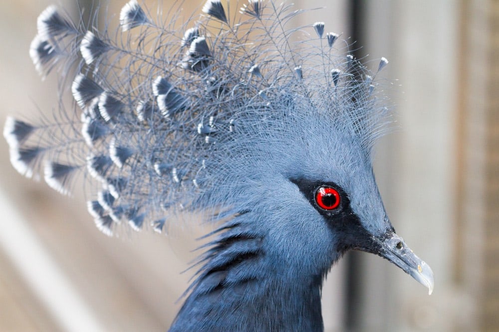 Đây là hình ảnh của bồ câu Vương miện Victoria, có nguồn gốc từ khu vực New Guinea. Chính bởi bề ngoài mỹ miều của mình, loài bồ câu này được đặt theo tên Nữ hoàng Victoria của Vương Quốc Anh (mang danh hiệu từ năm 1837-1901). Thoạt nhìn, chúng ta sẽ không nghĩ rằng trước mắt mình lại là một con chim bồ câu. Nó thực sự nổi bật với bộ lông vũ có màu xanh pha tím cùng chỏm lông dựng tuyệt đẹp tựa như vương miện trên đỉnh đầu.