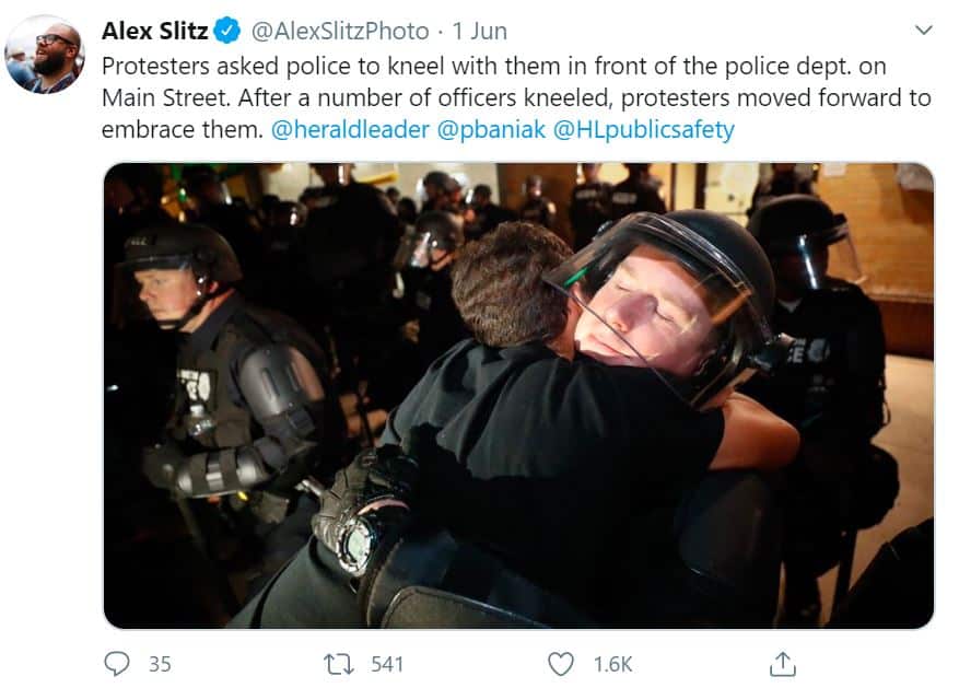Protesters asked police to kneel with them in front of the police dept. on Main Street. After a number of officers kneeled, protesters moved forward to embrace them. @heraldleader @pbaniak @HLpublicsafety pic.twitter.com/mZ8NiiEZPq