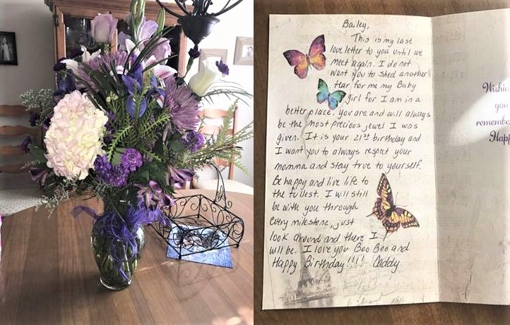 Ngoài những bông hoa xinh xắn, Bailey còn nhận được một lá thư viết tay mà cha đã chuẩn bị cho cô, cô chia sẻ: “Tôi đã suy sụp. Lá thư vô cùng vô cùng tuyệt vời nhưng tôi cũng rất đau khổ”. Để tỏ lòng kính trọng tới người cha cùng hành động ngọt ngào của ông dành cho mình, cô đã đăng tải hình ảnh món quà cuối cùng của cha dành cho cô lên Twitter.