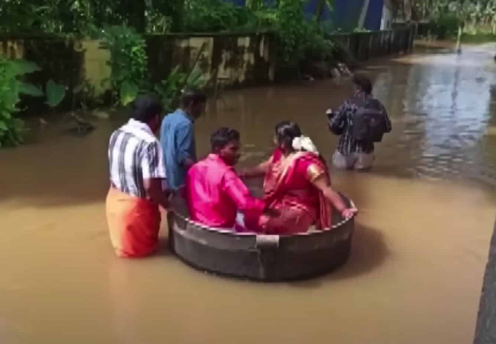 Thời xưa các cặp đôi thường cưỡi ngựa hoặc ngồi kiệu để đến tham dự hôn lễ, còn ngày nay, đa phần đều sẽ đi xe cưới. Thế nhưng mới đây tại khu vực bị lũ lụt ở bang Kerala của Ấn Độ lại có một cặp đôi trẻ ngồi trong một chiếc nồi nhôm rất lớn và được người khác đẩy đến nơi tổ chức hôn lễ. Mặc dù “phương tiện giao thông” này rất khác lạ, nhưng cuối cùng họ đã kết hôn thuận lợi. Đám cưới đặc biệt này sẽ khiến họ không bao giờ quên!