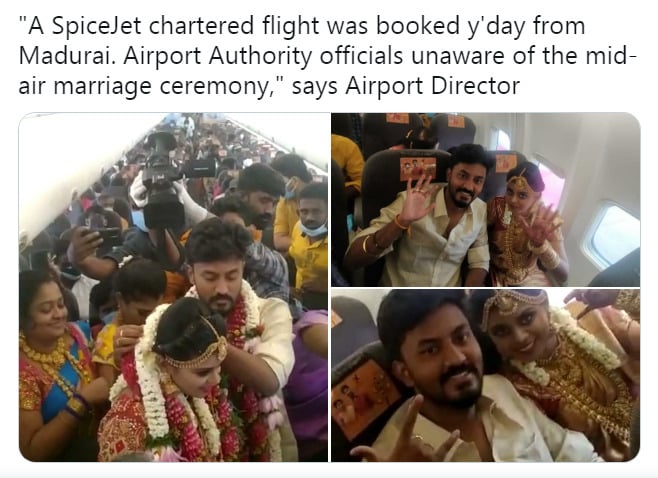 “A SpiceJet chartered flight was booked y’day from Madurai. Airport Authority officials unaware of the mid-air marriage ceremony,” says Airport Director pic.twitter.com/wzMCyMKt5m