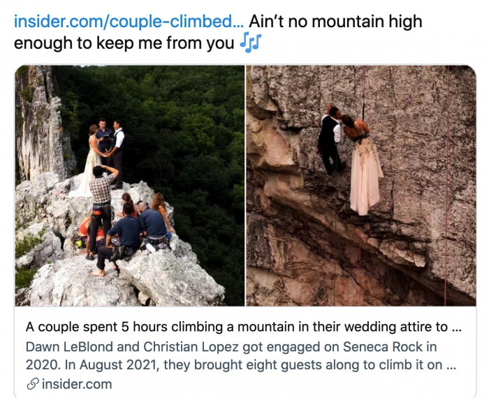 Cặp đôi Dawn LeBlond 35 tuổi và Christian Lopez 44 tuổi ngoài sở thích chung là leo núi, họ còn cảm thấy nhiều điểm tương đồng ở nhau. Điều đó giúp cho khoảng cách tuổi tác và việc quen nhau chỉ vài tháng không khiến họ băn khoăn khi quyết định làm lễ đính hôn trên đỉnh núi Seneca Rocks, Tây Virginia (Mỹ) vào tháng 10 năm 2020, theo Insider.