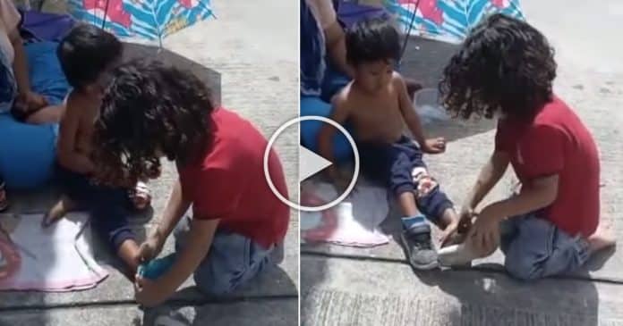 Hành động vô tư của cậu bé 2 tuổi khi tháo đôi giày mà mình đang đi để đeo vào chân cho một đứa trẻ vô gia cư trên đường phố đã khiến mọi người xúc động.