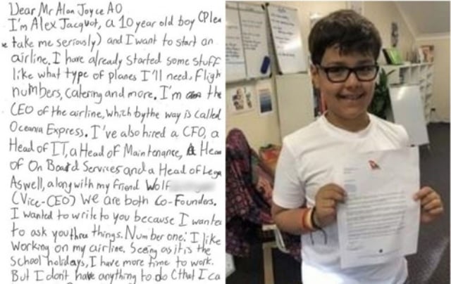 Theo tờ Daily Mail, cậu bé Alex Jacquot 10 tuổi người Úc mới đây đã viết thư cho CEO Alan Joyce của Hãng hàng không Qantas. Trong thư, cậu rất nghiêm túc cho biết hiện mình đang chuẩn bị để thành lập một hãng hàng không có tên “Oceania Express” do chính cậu làm CEO. Cậu còn chia sẻ rằng mình đã tìm được giám đốc tài chính, trưởng phòng kỹ thuật cũng như đã lên kế hoạch mô hình máy bay, số hiệu chuyến bay và những món ăn trên chuyến bay v.v…