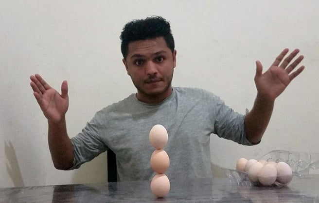 Từ đoạn video ngắn bên dưới chúng ta có thể thấy Muqbel chọn ra 3 quả trứng bất kỳ từ một khay trứng, sau đó nhanh chóng xếp chồng chúng lên nhau và tạo thành một “tháp trứng”. Sau vài giây, cậu thổi những quả trứng rơi xuống bàn, rồi bóp vỡ từng quả biểu thị không có sự giả dối gì ở đây.