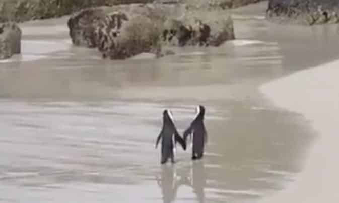 Một video quay cảnh hai chú chim cánh cụt xinh xắn đi dạo trên bờ biển đang lan truyền nhanh chóng trên mạng và trở thành một biểu tượng hoàn hảo của sự thủy chung.