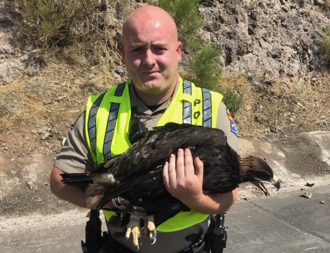 Hôm 18/6, một nhân viên an ninh đã dừng lại để kiểm tra đống vật thể trông giống như mảnh vỡ trên đường liên bang 17 gần Trại Verde và nhận ra đó là một con đại bàng vàng. Con chim này có kích thước như một con chó săn, đang mê sảng và không thể bay được, theo Metro.