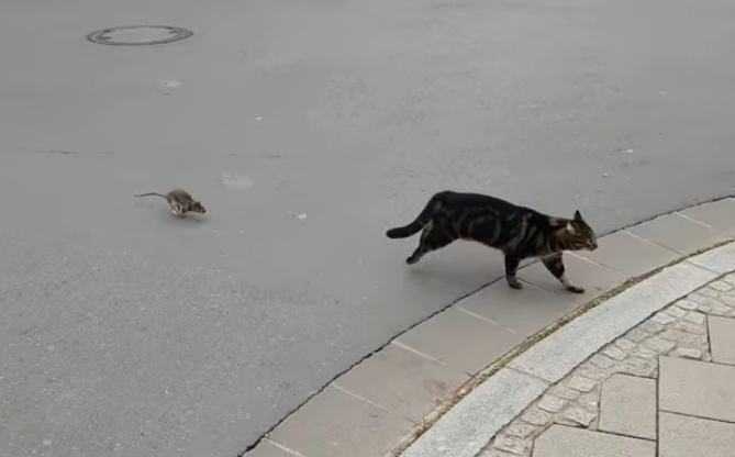 Thế nhưng, con chuột mạnh mẽ đã đảo ngược tình thế, đuổi lại chú mèo khiến chú ta hoảng sợ tháo chạy. Dù chú mèo đã chạy về phía bên này đường, nhưng con chuột dường như vẫn không chịu buông tha, cứ thế đuổi theo cho đến khi đoạn clip kết thúc thì chú mèo vẫn đang trong trạng thái “chạy cong đuôi”.