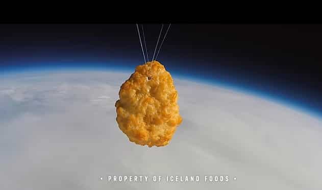 Siêu thị “Iceland” đã chia sẻ lên Youtube đoạn clip ghi lại hình ảnh miếng gà chiên cốm được gửi lên vũ trụ và viết rằng: “Đây là một bước đi nhỏ của con người và là bước đi lớn của miếng gà.”