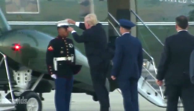 Lúc đến gần cửa máy bay, ông Trump nhìn thấy một chiếc mũ hải quân ở dưới đất, còn người lính bên cạnh lối lên máy bay lại không có mũ trên đầu, ông bèn cúi người nhặt chiếc mũ rồi đội lại lên đầu cho người lính và nhẹ nhàng vỗ vai anh này.