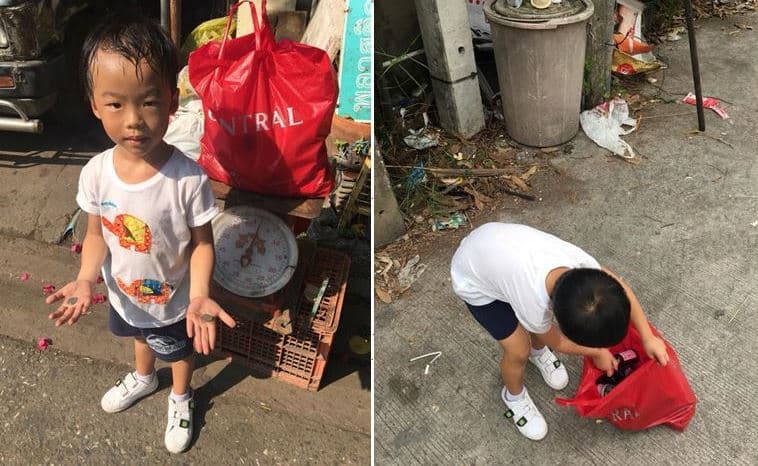 Người mẹ nói với con: “Nhặt vỏ chai rỗng có thể bán lấy tiền!”, cậu bé 5 tuổi ban đầu còn thích thú lắm. Họ đi chừng 3,5 km trên đường phố ở Bangkok, cậu con trai đang học mẫu giáo này đã nhặt chai nhựa và chai thủy tinh bên đường, sau một ngày ‘làm sạch Bangkok’, họ đã thu thập được một túi đầy nặng 2,2 kg. Cậu bé bán những thứ đã nhặt, tổng cộng có được 2 baht, lúc này cậu bé đã đổ mồ hôi như tắm, mệt lắm rồi.