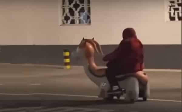 Hình ảnh một cụ bà mặc áo ấm, khăn trùm đầu, cưỡi trên con ngựa đồ chơi chạy bon bon trên đường phố vắng vẻ của Tô Châu, Trung Quốc vào buổi tối muộn trong cái lạnh 3 độ C đã được camera an ninh ghi lại.