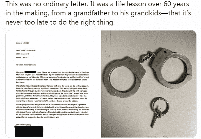 Một ông cụ ở bang California, Mỹ từng lấy trộm còng tay của cảnh sát vào 60 năm trước, nhiều năm sau ông vẫn luôn có cảm giác tội lỗi, nhưng chưa có hành động bù đắp lỗi lầm nào. Mới đây, để giáo dục cháu nội của mình, ông đã trả lại còng tay cho cảnh sát kèm theo một lá thư xin lỗi. Cảnh sát California nói rằng ‘không bao giờ là quá muộn để làm những điều đúng đắn’.