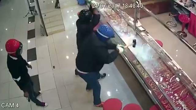 Nhóm cướp rất hùng hổ khi xông vào tiệm vàng nhưng rồi đành “thất thiểu” ra về khi dùng búa đập mãi mà kính không vỡ.