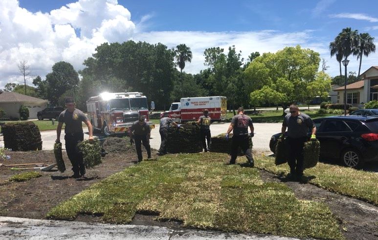 Trong khi anh chưa hiểu ra chuyện gì thì 7 nhân viên cứu hỏa và cứu thương đã nhảy xuống xe, mang theo găng tay làm việc nhanh chóng bước đến bên cạnh thảm cỏ và nói với anh: “Tạm thời ông Gene không thể xuất viện được, vì vậy chúng tôi đến giúp ông ấy hoàn thành công việc, bởi vì thảm cỏ mới không trồng kịp thì sẽ bị chết.”