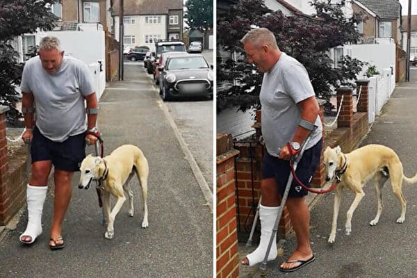 Hài hước chú chó bắt chước đi khập khiễng giống chủ bị gãy chân