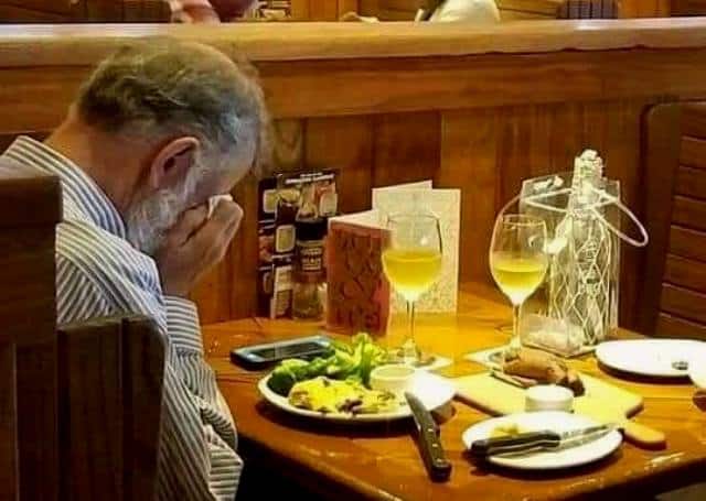 Người đàn ông ngồi một mình lặng lẽ, cạnh đó là 2 ly rượu. Đối diện là bình tro của người phụ nữ của đời ông. Và ông khóc….