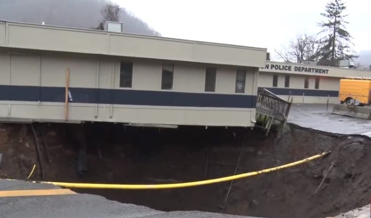 Những cơn mưa xối xả đã làm cho hố tử thần ở Virginia mở rộng đến mức có thể làm sập một công trình nhỏ. Hiện tại, một phần của tòa nhà sở cảnh sát đang đứng chấp chới trên mép hố.
