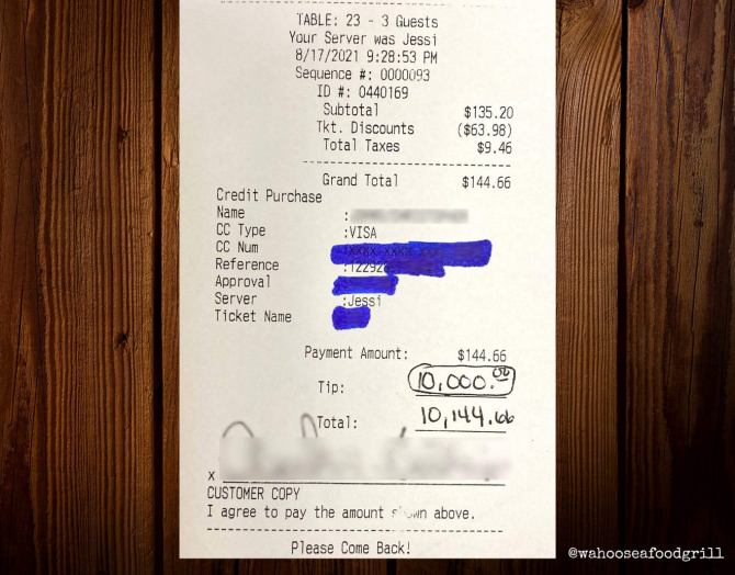 Hóa đơn chỉ 144 USD nhưng vị khách lạ trả thêm 10.000 USD tiền tip