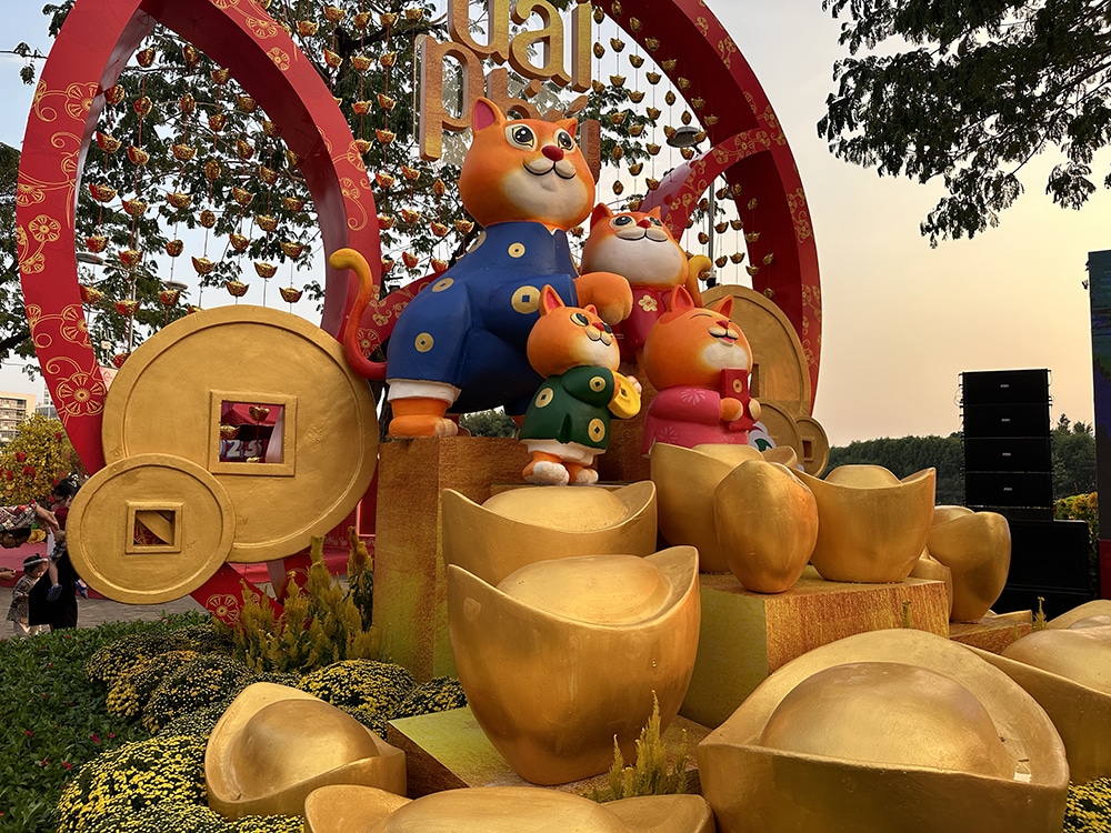 Đường hoa Phú Mỹ Hưng Tết Quý Mão 2023. Khu vực “Phú”, một trong 3 khu vực thuộc Đường hoa gồm “Phú, Mỹ và Hưng”, thể hiện sự sung túc, thịnh vượng với các thỏi vàng, tiền đồng và bao lì xì đỏ. (Ảnh: Trí Thức VN)
