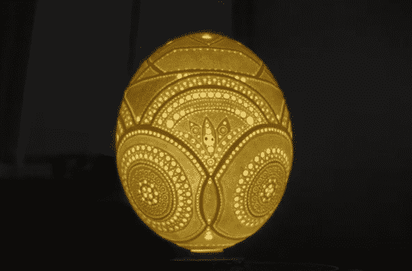 Một nghệ nhân người Việt đã dành 3 năm để khoan hơn 45.000 lỗ trên một vỏ trứng đà điểu, làm thành một tác phẩm đèn trang trí tuyệt đẹp với họa tiết bông hoa sen ở trên đỉnh và hình trống đồng xung quanh vỏ trứng.
