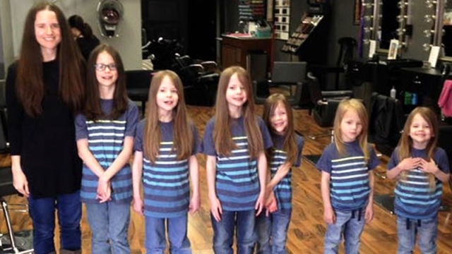 Sau hai năm, đến khi tóc của các bé đều dài gần bằng nhau, cuối cùng 6 anh em đã sẵn sàng để cùng mẹ đi cắt tóc. 7 người trong gia đình đã quyên tặng được 5m tóc vàng.