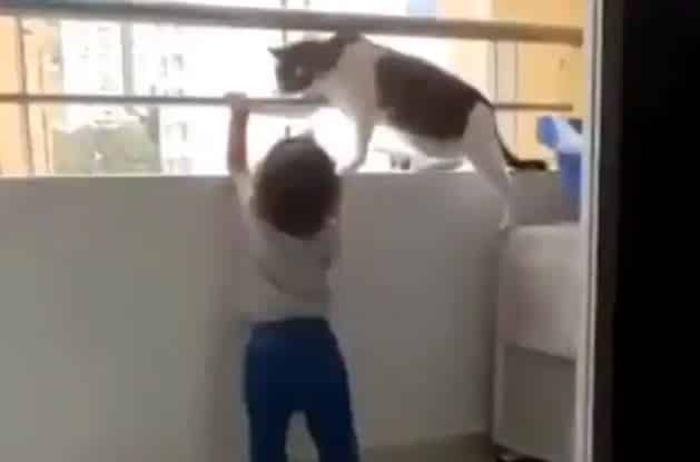 Mèo ‘cứu’ bé trai đang cố trèo qua lan can ban công