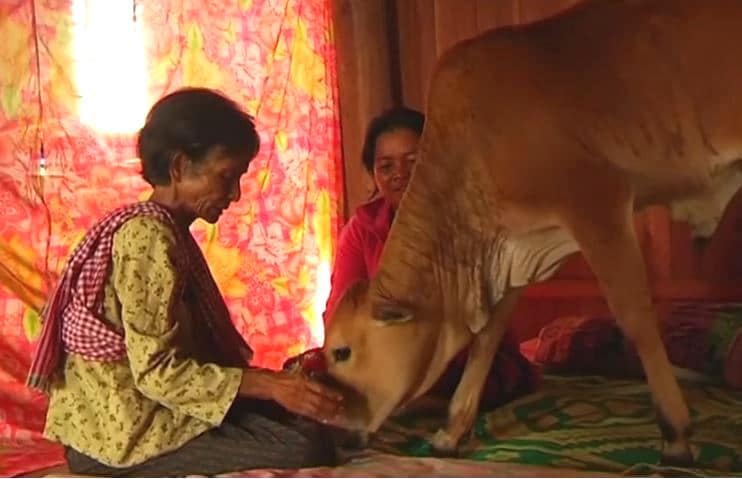 Người phụ nữ 74 tuổi ở tỉnh Kratie – Campuchia này đã rất đau khổ sau khi chồng bà – ông Tol Khut đột ngột qua đời 1 năm trước. “Khi tôi đến nhà 1 bà đồng, linh hồn của ông ấy đến và nói rằng ‘tôi là chồng của bà’. Sau đó tôi thấy con bê liếm lên tóc, lên cổ tôi và hôn tôi, vì vậy tôi thực sự tin rằng con bê ấy chính là chồng mình”, bà Khim Hang kể với Reuters.
