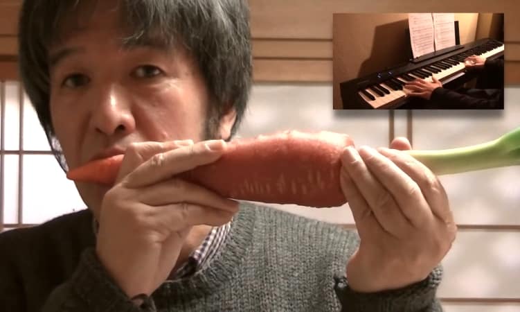 Khi biểu diễn nhạc cụ rau củ, biểu cảm của nghệ sĩ Junji Koyama rất phong phú khiến ca khúc thêm sinh động.