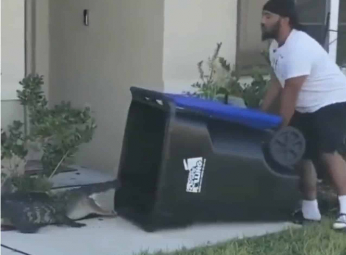 Người đàn ông bắt con cá sấu bò ngoài nhà bằng… thùng rác