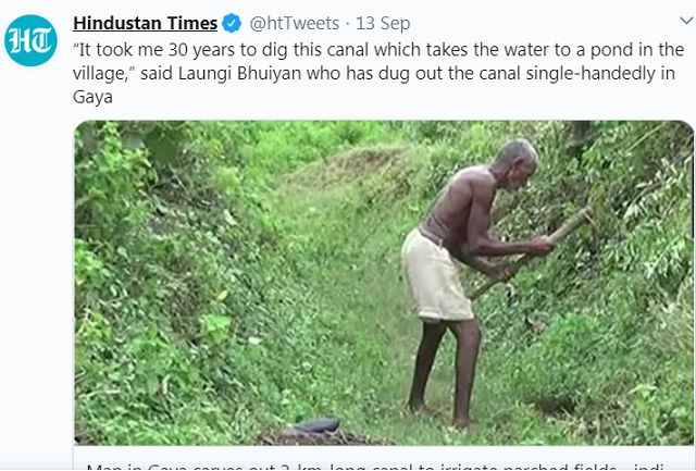Một người đàn ông ở bang Bihar của Ấn Độ đã dành 30 năm một mình đào con kênh dài 3 km chỉ bằng những dụng cụ hết sức thô sơ để dẫn nước sông vào làng cho người dân và vật nuôi sử dụng. Câu chuyện về lòng tốt, sự quyết tâm và nghị lực của ông đã được rất nhiều người khâm phục và khen ngợi.