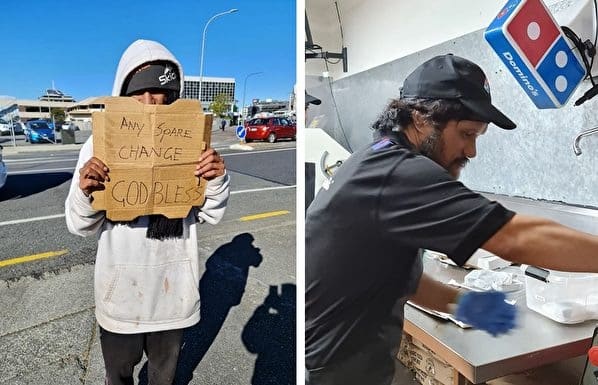 Mới đây, một người đàn ông ở New Zealand bị thất nghiệp và vô gia cư do chịu ảnh hưởng bởi dịch bệnh Covid và phải ăn xin trên đường phố thì bất ngờ được trao cơ hội làm việc tại một cửa hàng pizza Domino để tìm lại cuộc sống trước đây.