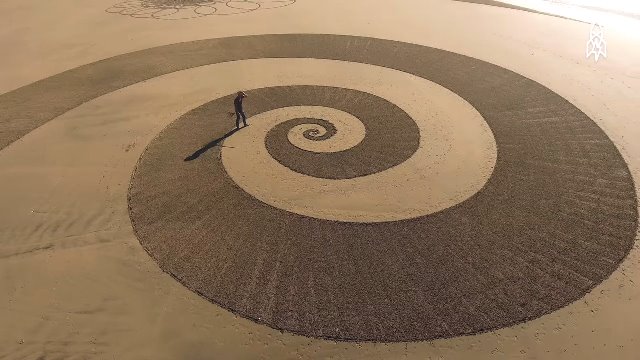 Nghệ sĩ Jim Denevan đến từ Mỹ rất yêu thích và có tài năng vẽ nên những bức tranh khổng lồ (thường là mô hình hình học) trên bãi cát, nếu nhìn từ trên cao sẽ có cảm giác như những bức tranh này nổi trên mặt đất, rất thu hút.