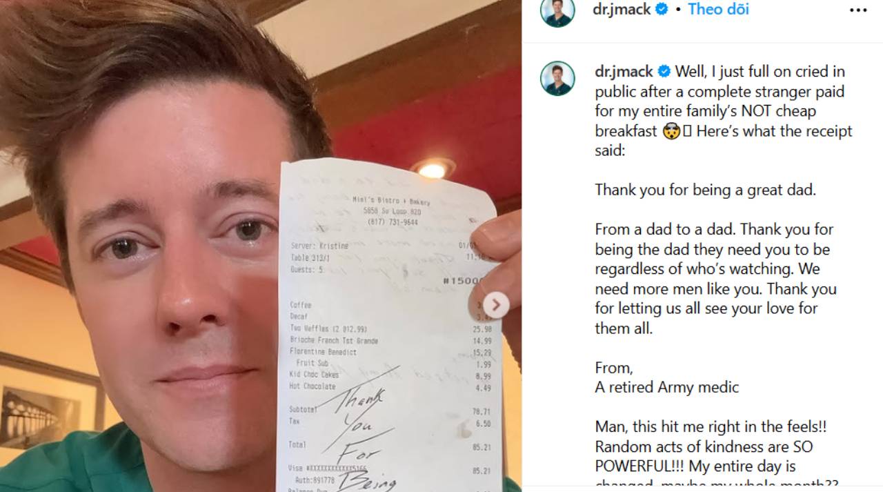 Khi anh chuẩn bị trả tiền thì nhân viên phục vụ thông báo rằng hóa đơn 85,21 USD của gia đình đã được ai đó thanh toán xong rồi. Sau đó, nhân viên đưa cho anh tờ biên lai kèm lời nhắn: “Từ một người cha gửi đến một người cha. Cảm ơn anh vì đã làm một người cha tuyệt vời. Thế giới này cần nhiều người đàn ông giống như anh. Cảm ơn anh đã cho chúng tôi thấy tình yêu chân thành mà anh dành cho gia đình của mình. Ký tên: ‘Từ một cựu quân y đã nghỉ hưu’”.