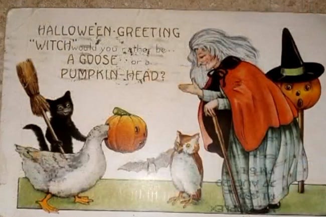 Trên tấm bưu thiếp còn có những hình ảnh liên quan đến lễ hội Halloween như phù thủy, cú mèo, mèo, ngỗng v.v…, và có đề tên người nhận là Roy McQueen.