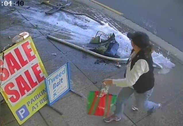 Không ngờ là chỉ vài giây sau đó, một chiếc xe hơi bị mất lái bỗng lao về phía phần đường dành cho người đi bộ, không chỉ làm hỏng biển chờ xe buýt và túi đồ của cô, mà còn tông vào cửa hàng gần đó. Người điều khiển chiếc xe này đã bị thương và được đưa đến bệnh viện ngay sau đó.