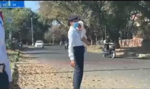 Nữ cảnh sát Ấn Độ vừa bế con vừa điều tiết giao thông