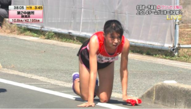 Người đồng đội chờ ở phía trước đã rơi nước mắt khi nhìn thấy Rei Iida đang cố gắng bò trên đường đua với 2 đầu gối xây xước chảy đầy máu để chuyển dải băng tiếp sức cho mình.