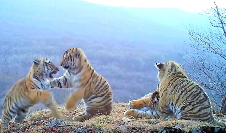 Hổ mẹ Siberia đưa những con hổ con lên đỉnh núi, sau đó đi về phía thung lũng, có thể là để đi săn mồi. Những con hổ con ngoan ngoãn đợi ở đó cả ngày, chúng ngủ hoặc chơi đùa cùng nhau rất nghịch ngợm đáng yêu.