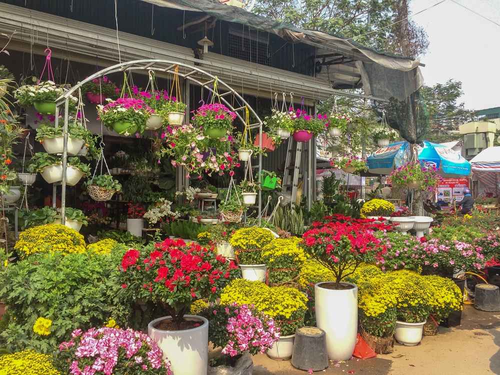 Dọc đường nào mai, nào đào, rồi quất, bưởi, phật thủ,… những chậu lan, cây cảnh, hay những chú cá vàng tung tăng bơi lội, đem hương sắc mùa Xuân ngập tràn con đường vốn hàng ngày chỉ tấp nập còi xe, khiến ai nấy tuy vội vàng công việc, cũng không khỏi rộn ràng trước rừng hoa.