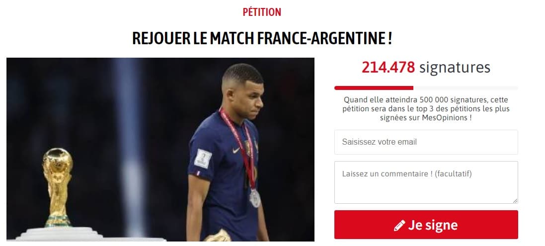 Hơn 200.000 người đã tham gia lời kêu gọi yêu cầu Liên đoàn Bóng đá Thế giới (FIFA) tổ chức lại trận chung kết World Cup 2022 khi cho rằng đội tuyển Pháp bị xử ép, theo nhật báo thể thao Marca.