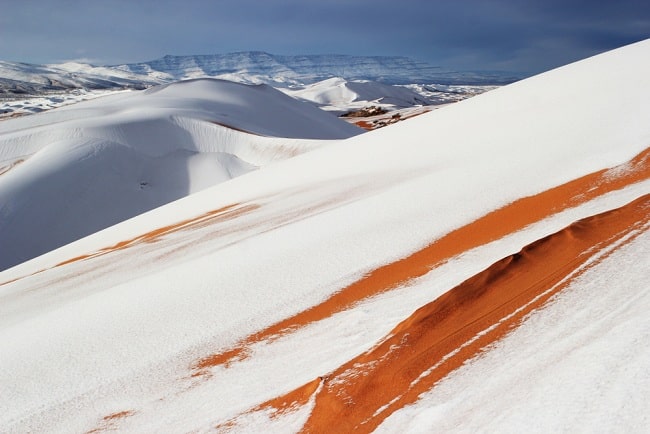 Khí hậu ở sa mạc Sahara vô cùng nóng bức, nhưng mới đây một phần khu vực này nhiệt độ lại xuống đến – 3℃ và xuất hiện hiện tượng tuyết rơi hiếm gặp, biến cồn cát thành một vùng trắng xóa hệt như thế giới cổ tích.